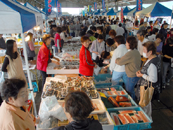 アオリイカ、マハタ、干物、大敷汁などの無料試食コーナーや