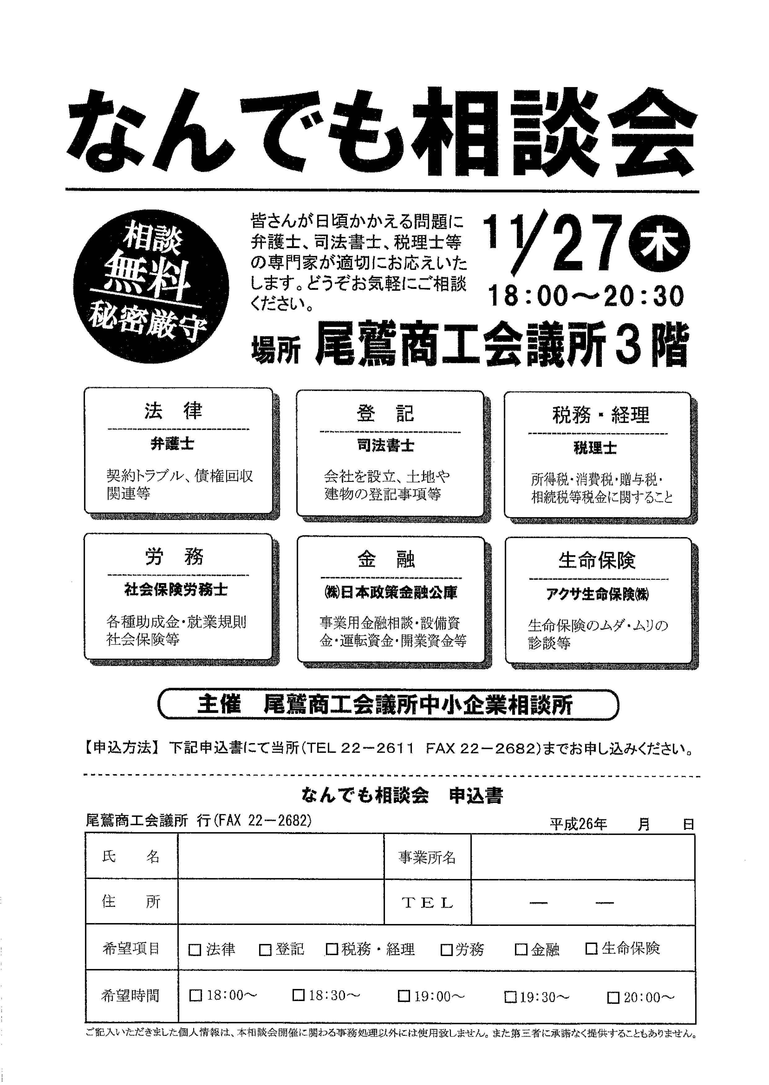なんでも相談会開催のご案内(11月27日(木)於:当商工会議所)