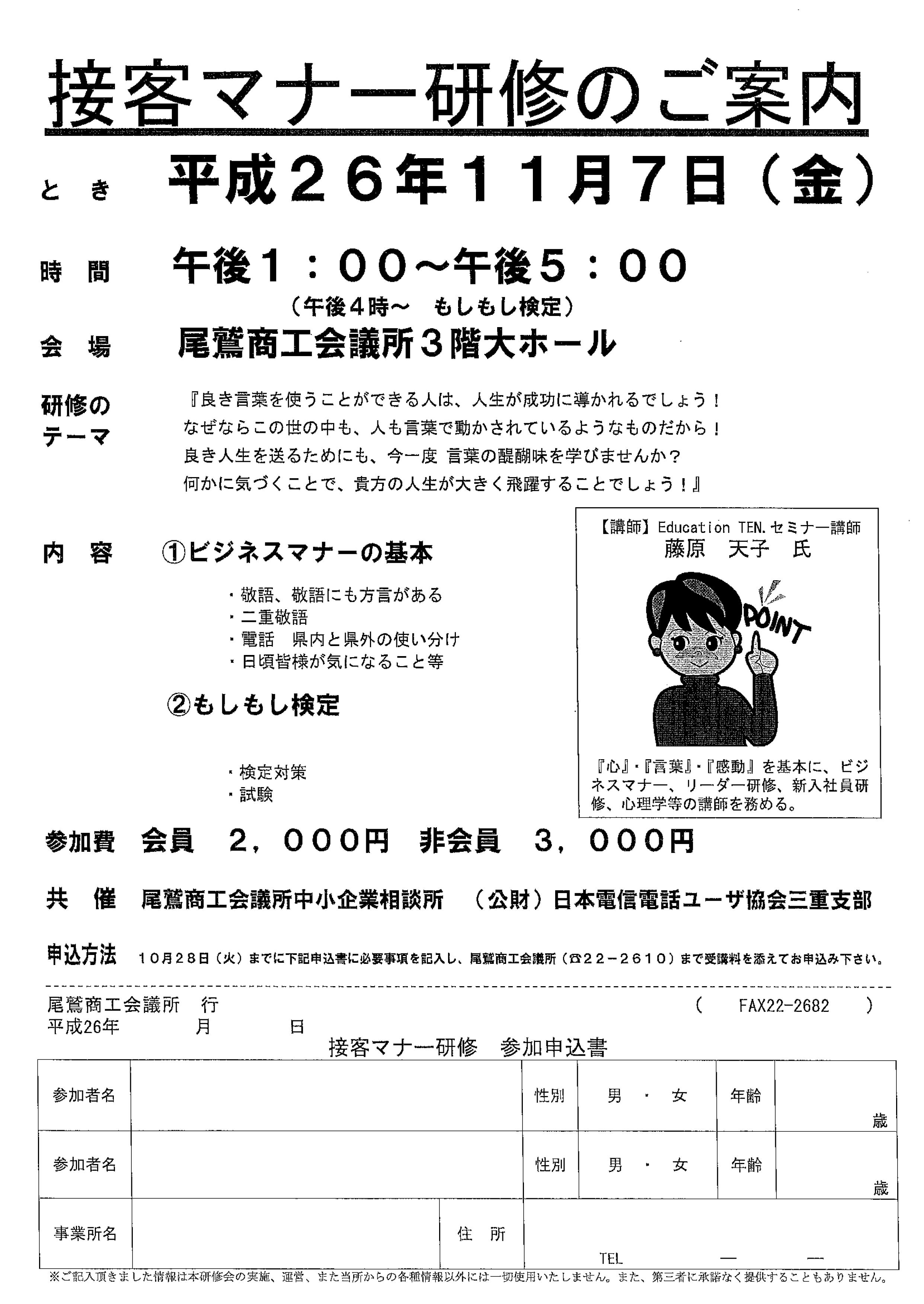 接客マナー研修のご案内(11月7日(金)於:当商工会議所)