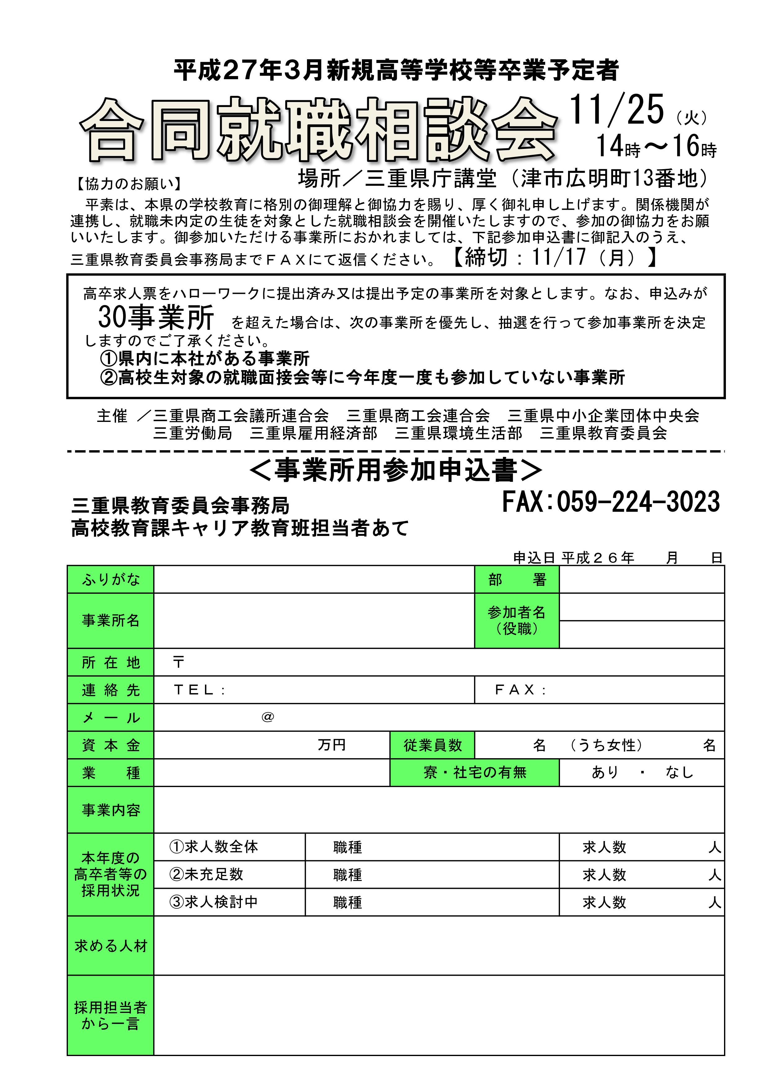 平成27年3月新規高等学校等卒業予定者合同就職相談会~参加事業所募集のご案内~(11/25(火))