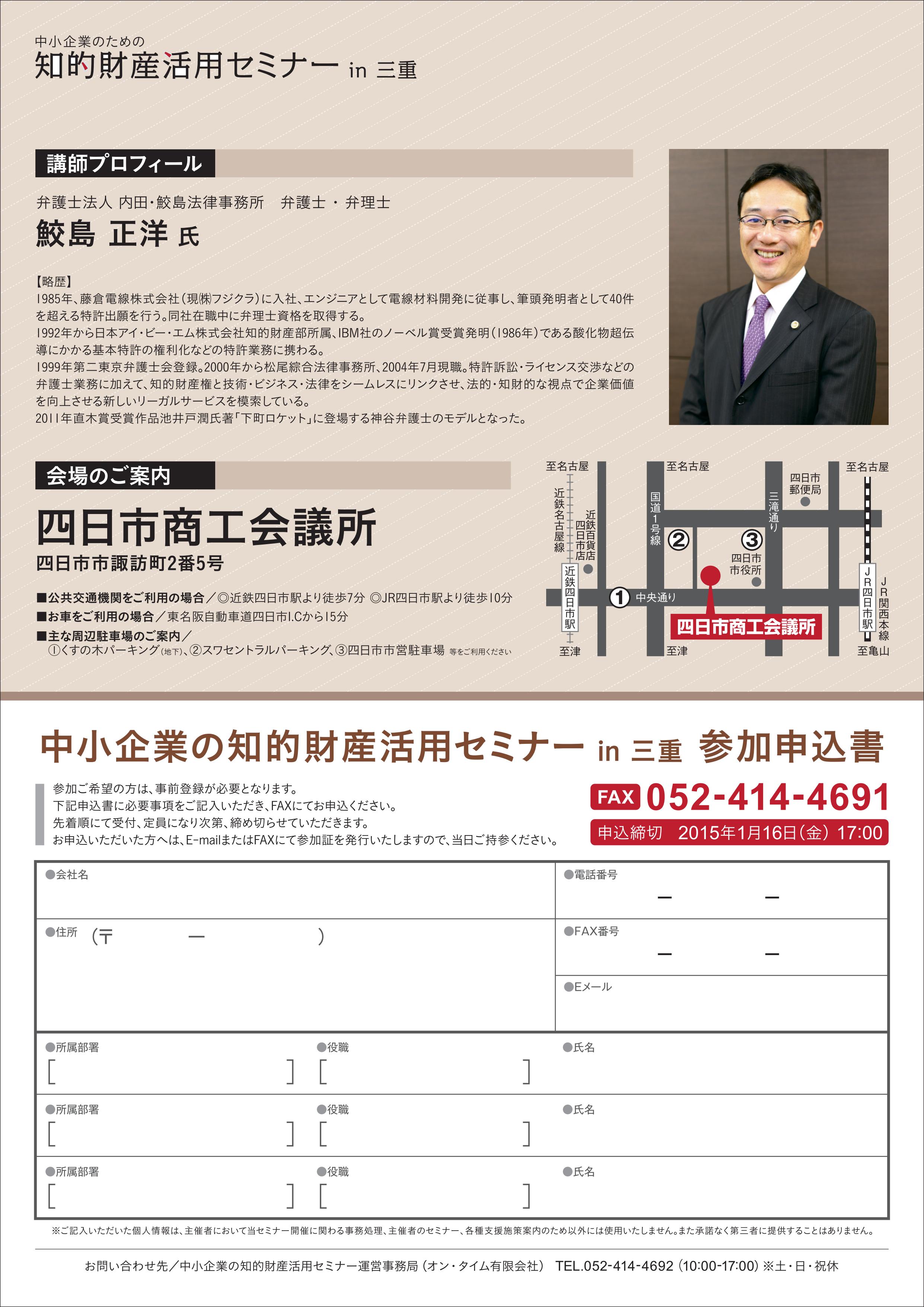 中小企業のための知的財産活用セミナーin三重(H27.1.20(火)於:四日市市)