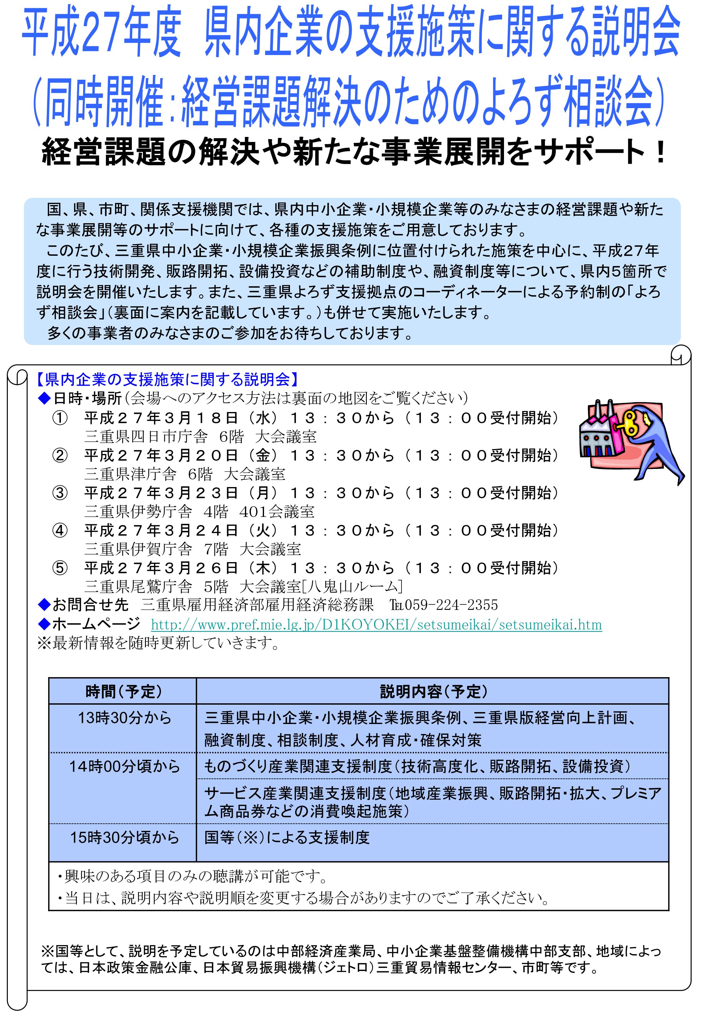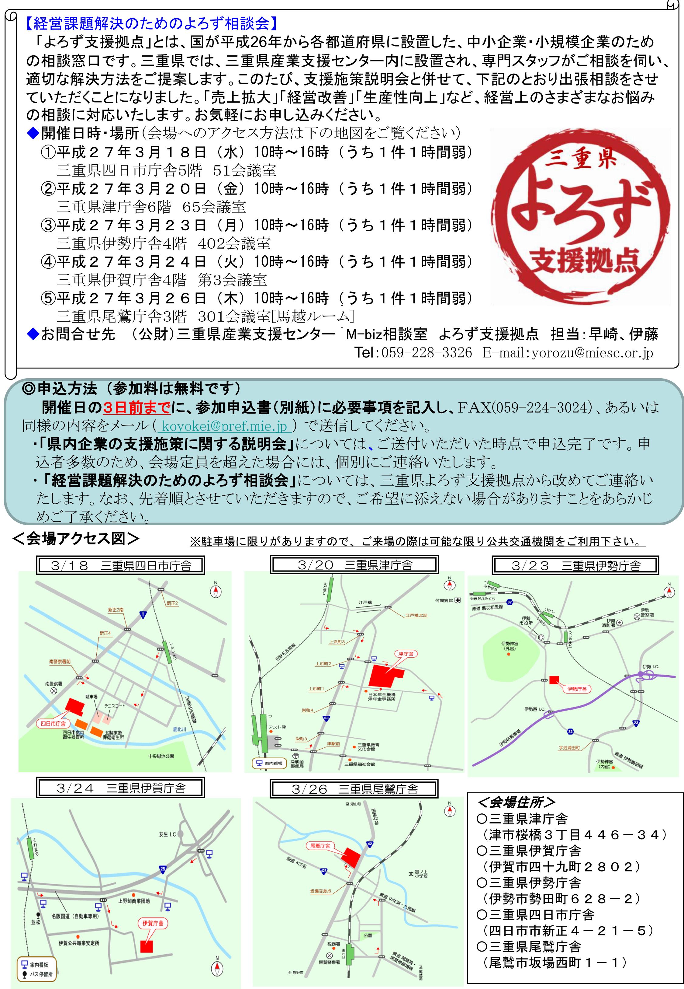 平成27年度県内企業の支援施策に関する説明会(同時開催:経営課題解決のためのよろず相談会)於:3月26日(木) 三重県尾鷲庁舎