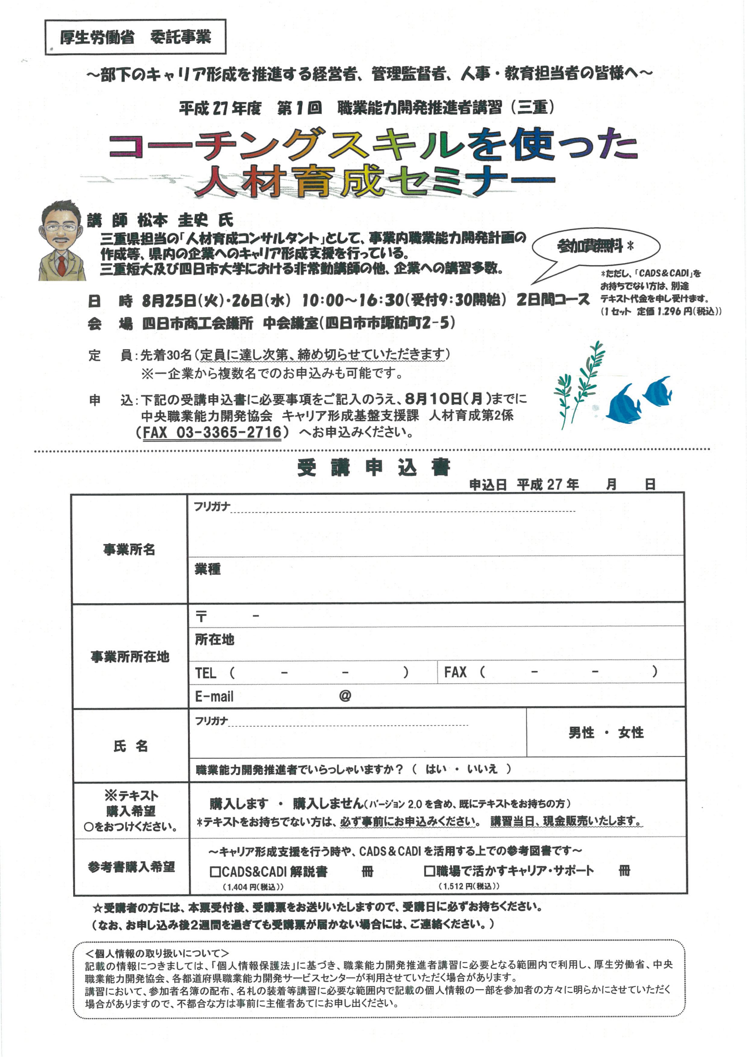 平成27年度第1回職業能力開発推進者講習(三重)コーチングスキルを使った人材育成セミナー(8/25・26(火・水)於:四日市)