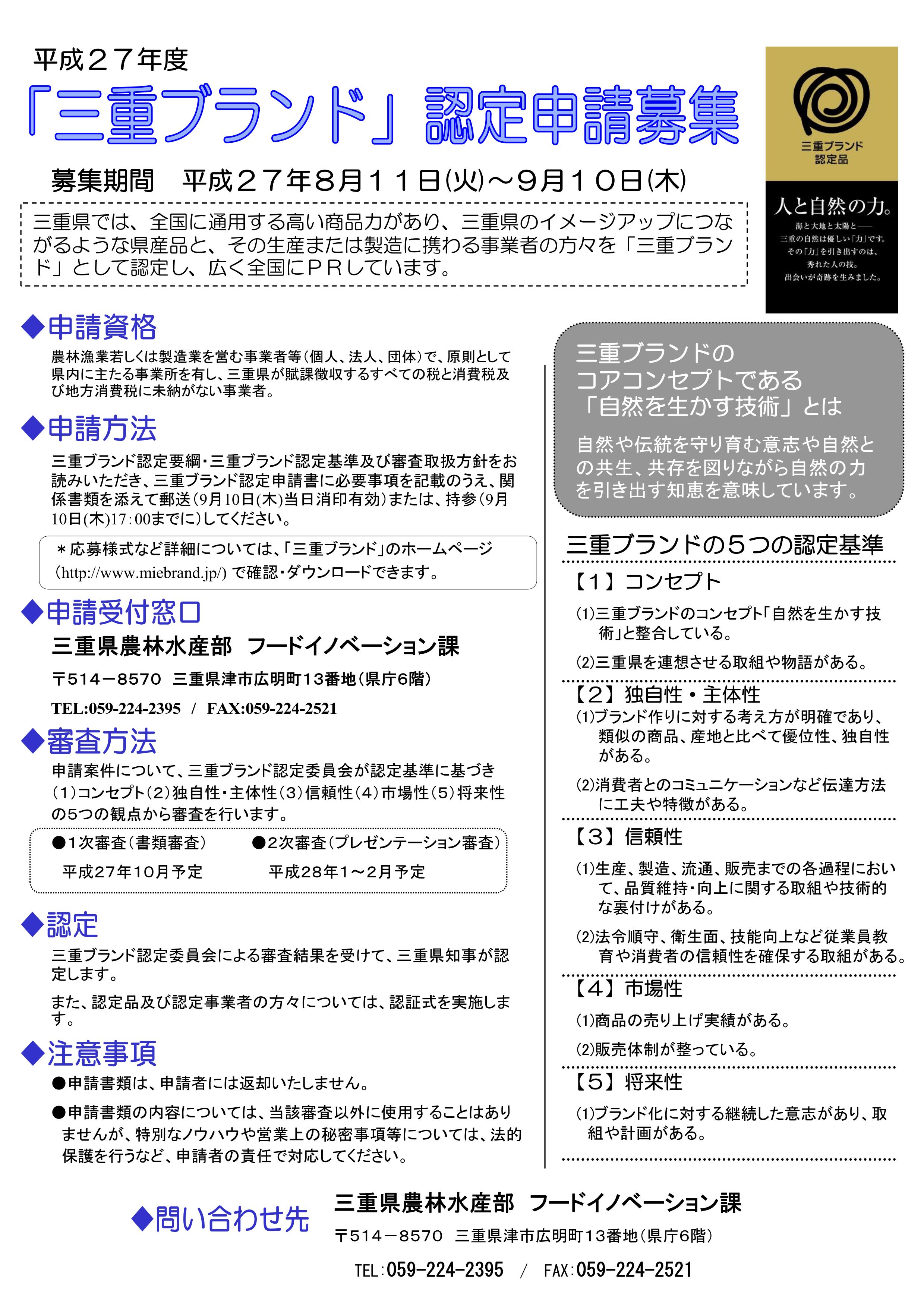 平成27年度「三重ブランド」認定申請募集!募集期間8/11~9/10