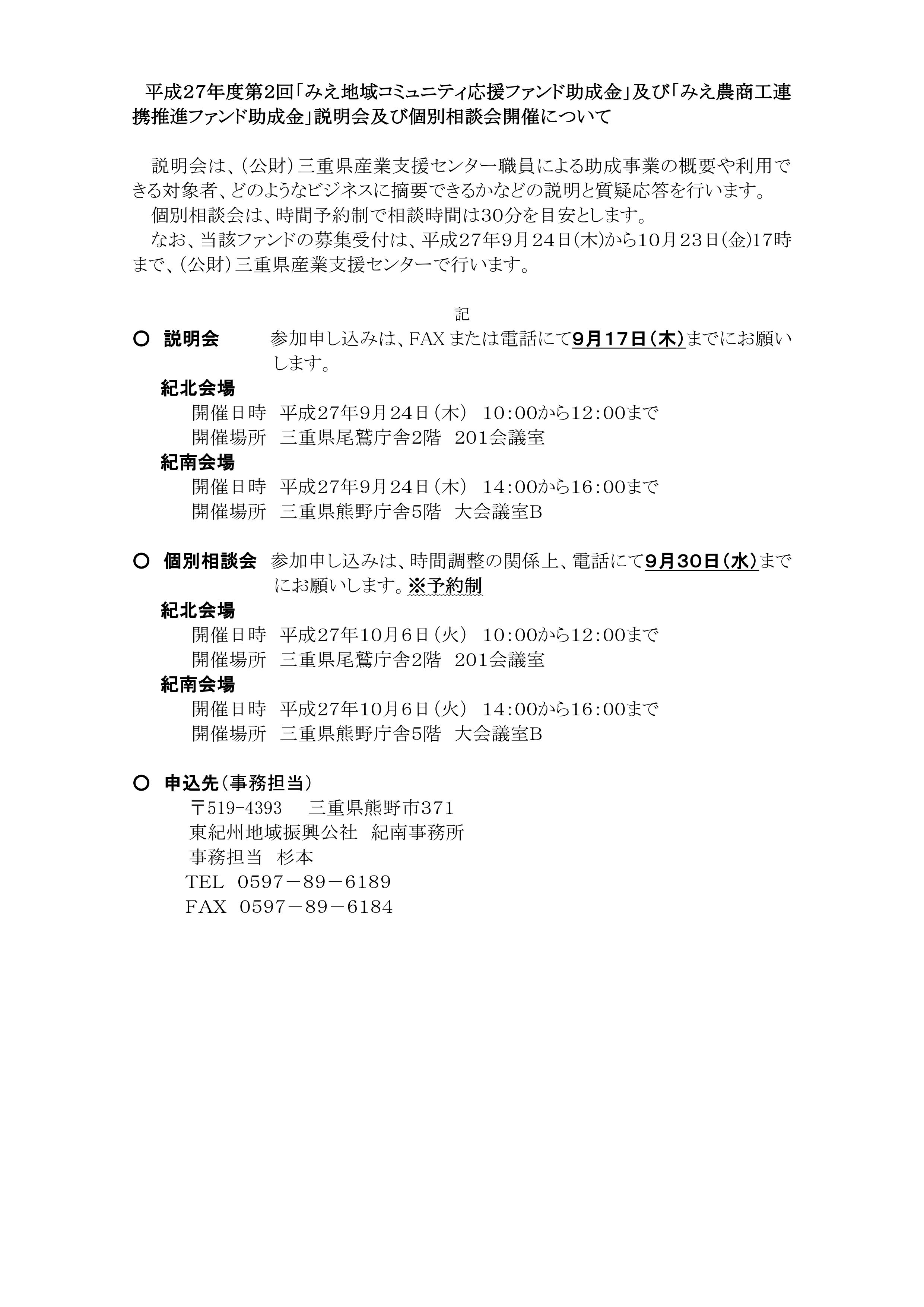 平成27年度第2回「みえ地域コミュニティ応援ファンド助成金」及び「みえ農商工連携推進ファンド助成金」説明会及び個別相談会開催について