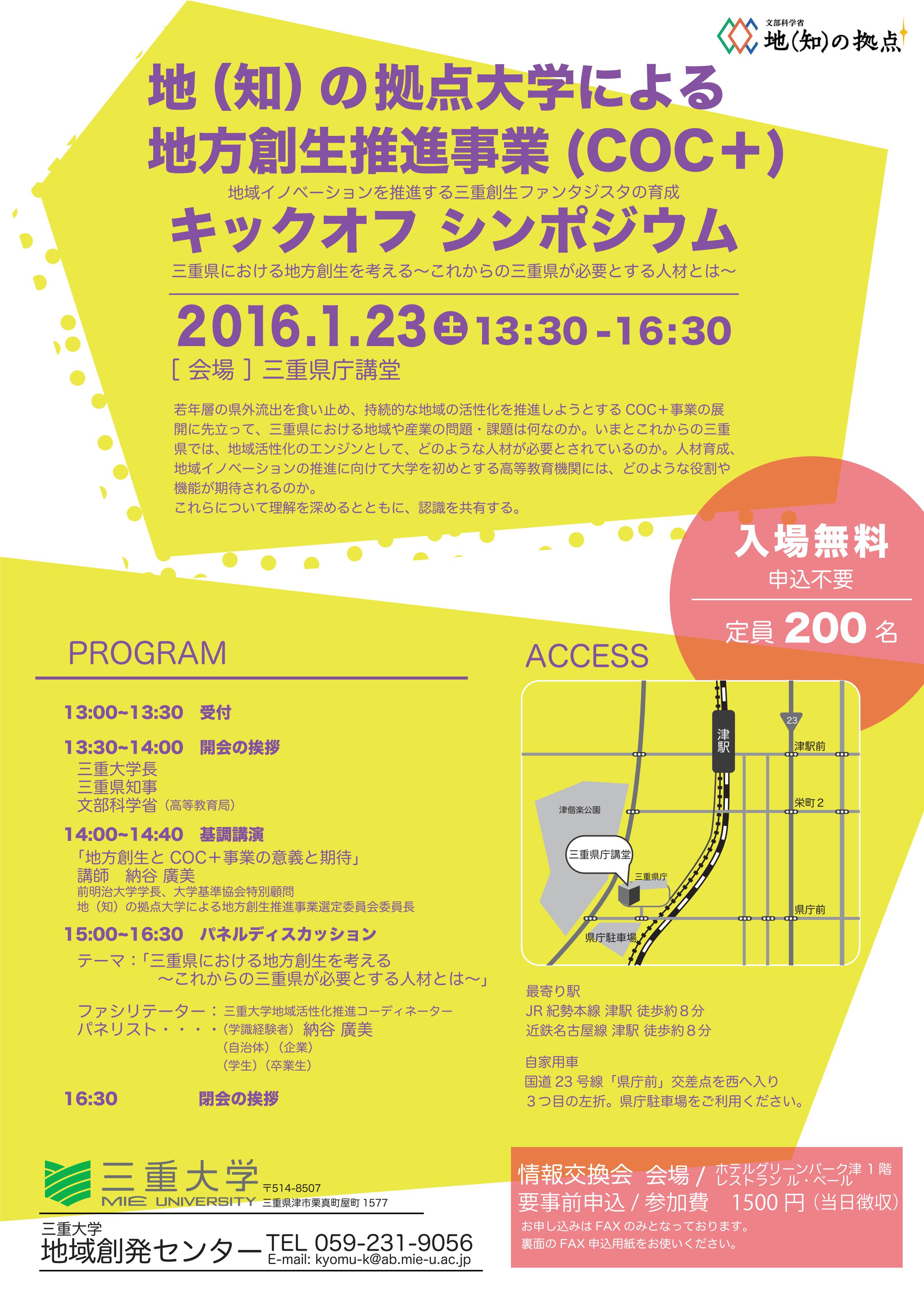 地(知)の拠点大学による地方創生推進事業(COC+)キックオフシンポジウム(1/23(土)於:三重県庁講堂)
